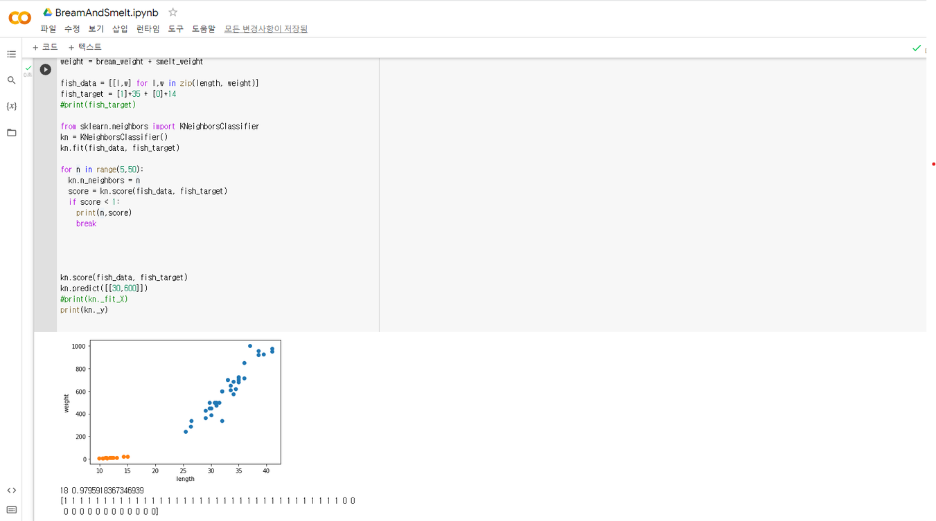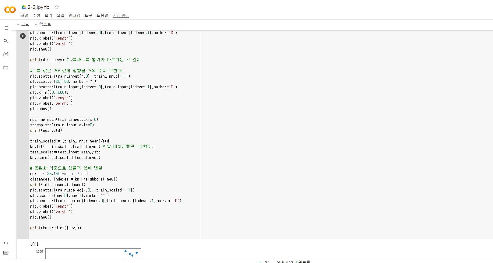 기본 미션 - 코랩 머신러닝 실습 화면 캡처