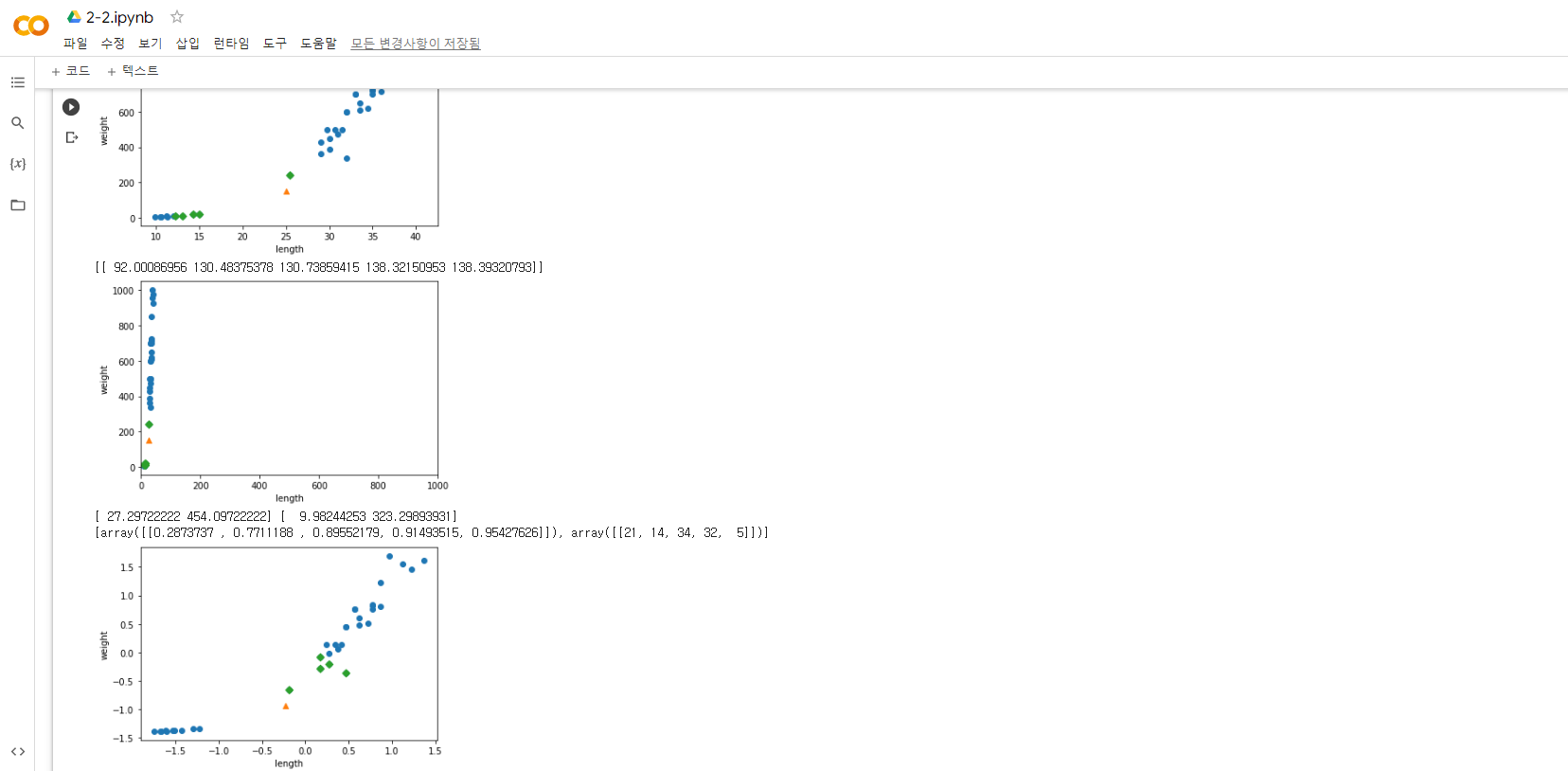 그러나! 마지막 부분에서 표준점수 처리하고 다이아몬드로 표시되어야 할 테스트 표본 근처 데이터들이 가장 멀리 떨어진 곳으로 자꾸 마킹되었습니다. 무엇을 빠뜨렸을까, 차근차근 보니 fit함수를 표준점수변환한 후 또 한 번 사용해야 했더군요. 점수 변환 처리만 해서는 안되고 훈련도 해줬어야 했죠. 실은 너무 당연한 얘기인데, 교재를 너무 생각 없이 따라가기만 하니 무심코 빠뜨린 내용이라 애 좀 먹었습니다. 늘 인공지능을 다룰 때는 자체적으로 함수를 만들어나가는 '훈련'의 과정을 염두에 두어야겠습니다.