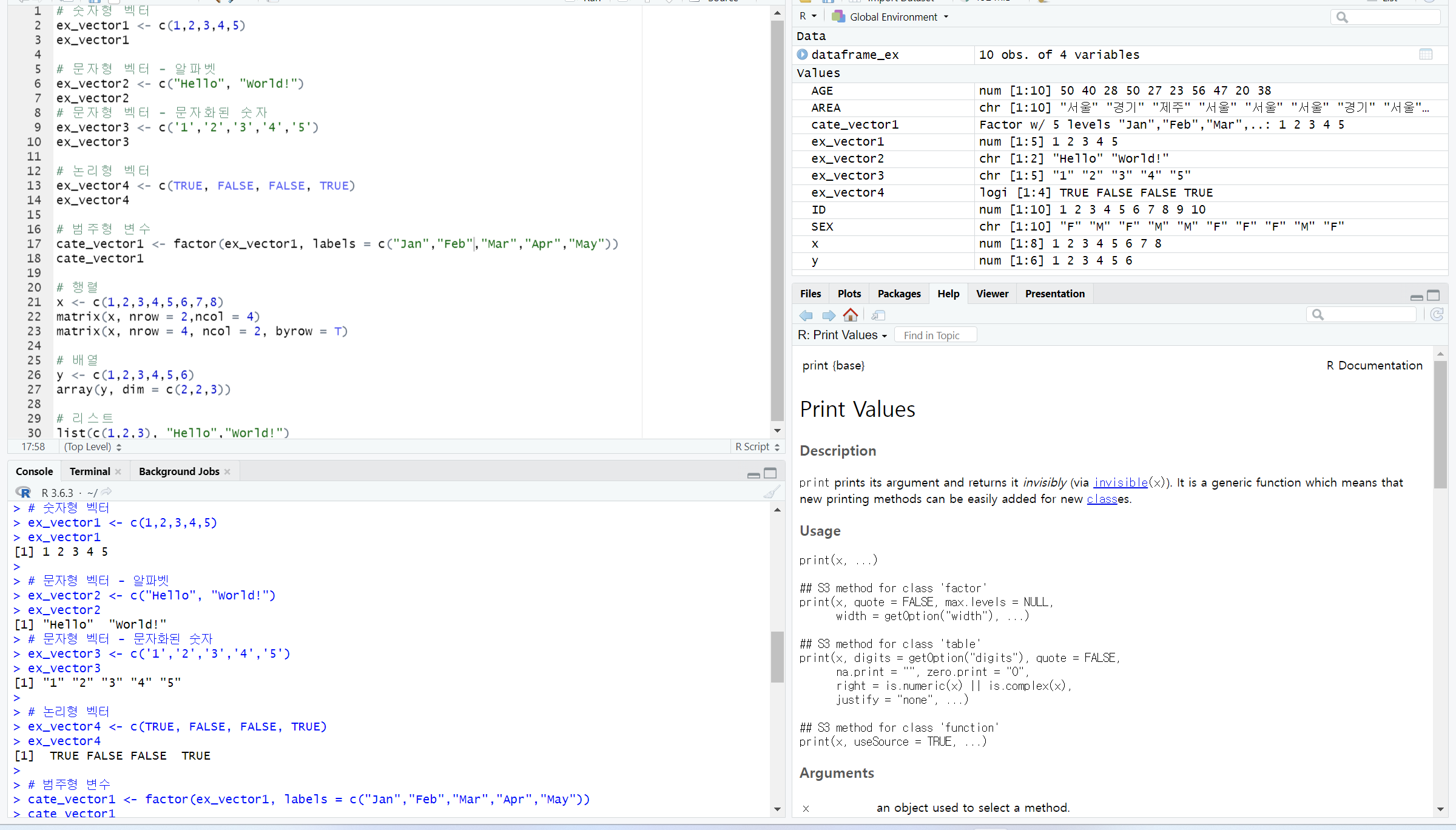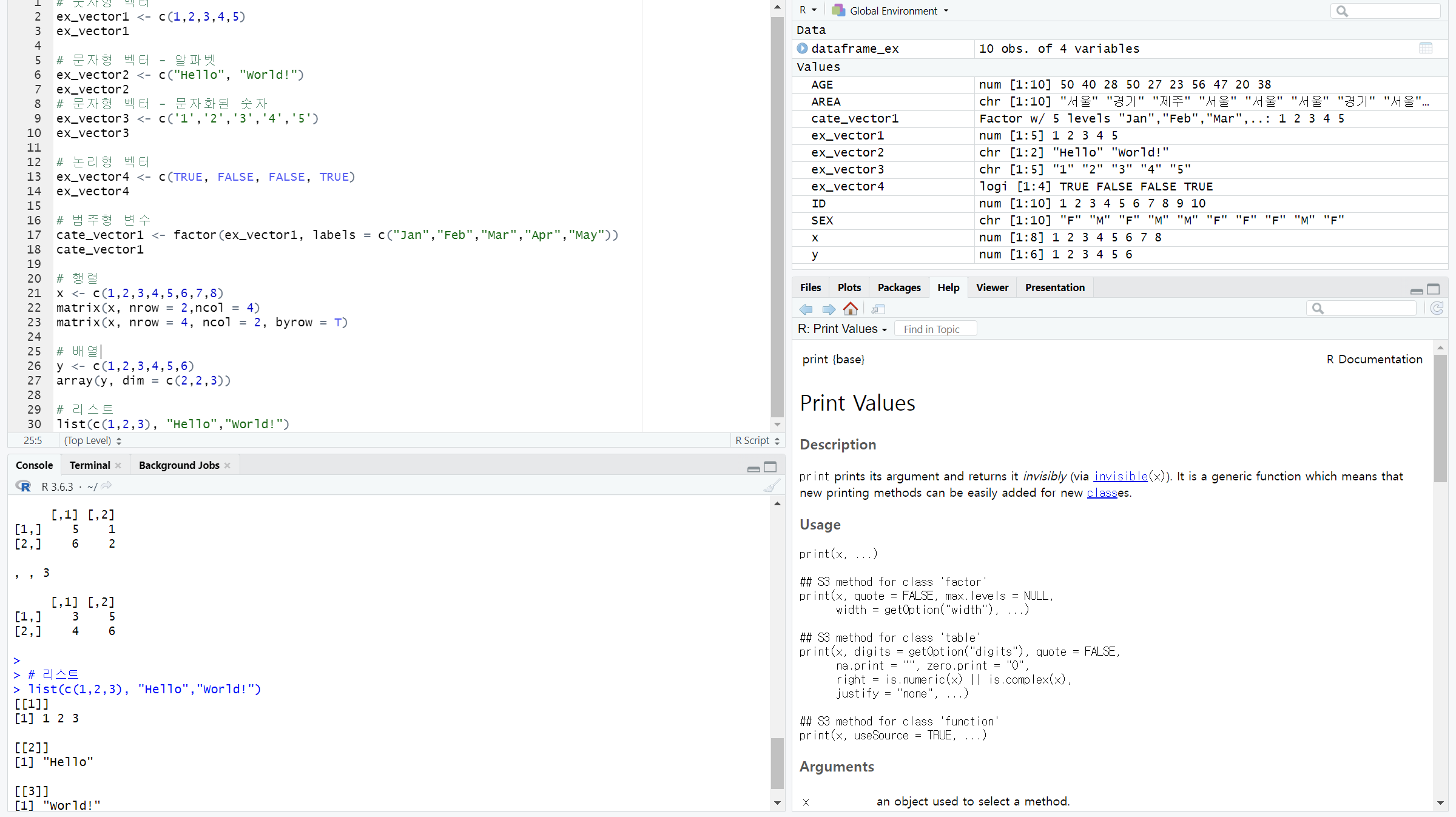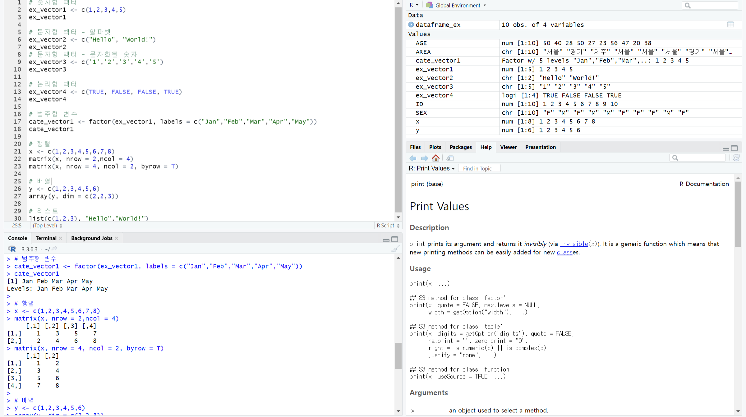 두 번째 소단원은 '데이터의 형태'에 따른 분류가 주였던 것 같습니다. 이것 역시 통계 수업에서 주구장창 했었죠. 그리고, SQL에서 많이 쓰는 테이블 용어도 나와서 내심 반가웠습니다. 이번 단원에서는 이런 용어들, 분류들을 실제로 R언어 환경에서 생성하고 조직하는 방법을 배우게 되었죠. 매우 간단했지만, 그래서 오히려 R언어가 어려운 언어가 아니라는 믿음이 더욱 굳건해진 시간이었습니다. ㅋㅋ