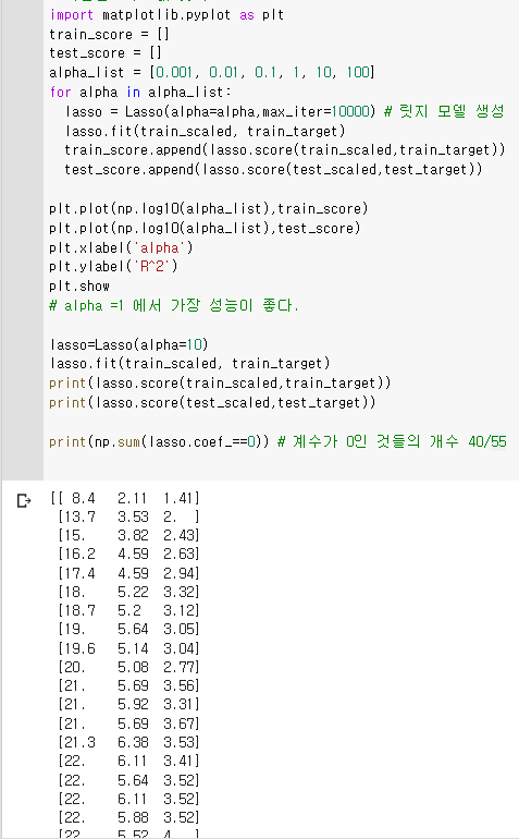 앞으로도 아마 제가 모르는 내용이 더 많을 것 같습니다. 그래서 계속해서 스스로 찾아보는 작업도 필요할 것 같아요. 이번에 릿지, 라쏘 회귀에 대해서는 물음표가 가득해 구글링을 하면서 봤는데 못 볼걸 본 기분입니다. 다들 복잡한 수식으로 알고리즘을 설명하고 있었거든요. 뭐.. 둘의 차이점을 위주로만 간단히 이해하고 넘어갔습니다. 그런데 찾다 보니 두 가지 회귀를 절충한 엘라스틱 넷이라는 것도 있더라고요? 대부분 릿지를 사용하긴 하지만 엘라스틱 넷도 때에 따라 쓰인다고 하니 기억해 두면 좋겠네요.