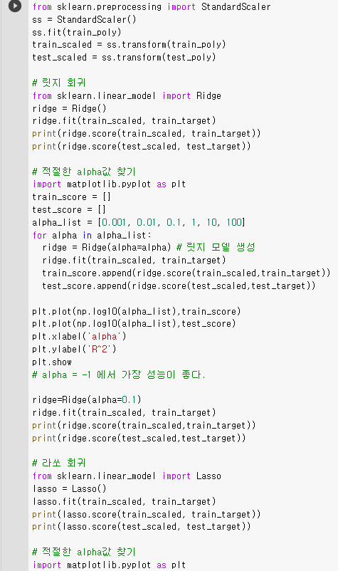 앞으로도 아마 제가 모르는 내용이 더 많을 것 같습니다. 그래서 계속해서 스스로 찾아보는 작업도 필요할 것 같아요. 이번에 릿지, 라쏘 회귀에 대해서는 물음표가 가득해 구글링을 하면서 봤는데 못 볼걸 본 기분입니다. 다들 복잡한 수식으로 알고리즘을 설명하고 있었거든요. 뭐.. 둘의 차이점을 위주로만 간단히 이해하고 넘어갔습니다. 그런데 찾다 보니 두 가지 회귀를 절충한 엘라스틱 넷이라는 것도 있더라고요? 대부분 릿지를 사용하긴 하지만 엘라스틱 넷도 때에 따라 쓰인다고 하니 기억해 두면 좋겠네요.