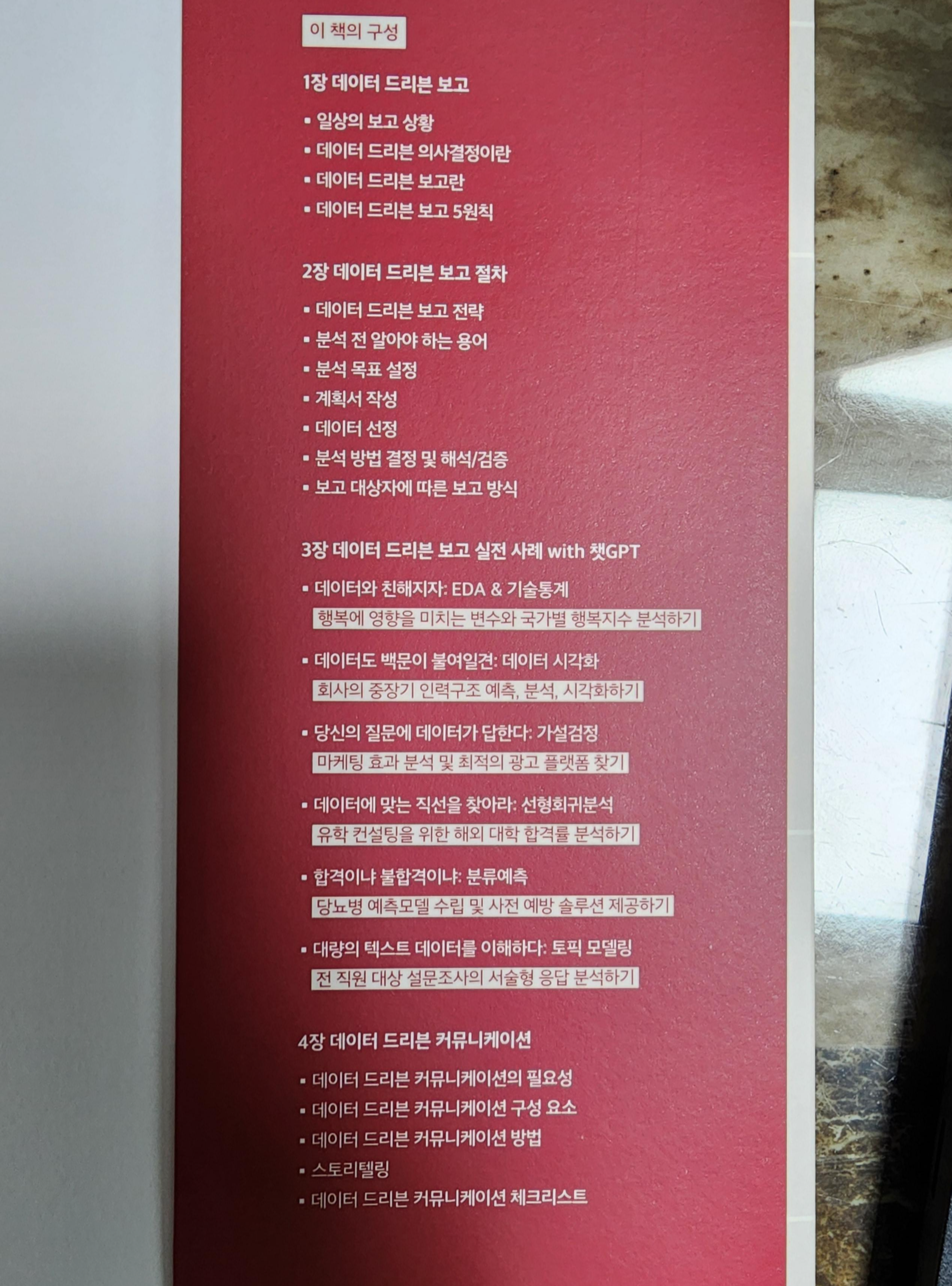 앞서 설명했다시피, 이 책은 보고를 위한 통계법들을 알려주는 데 포커싱이 되어있습니다. 그렇지만, 기본적으로 설득력 있는 보고를 위해 쓸 수 있는 기술들도 기록되어 있습니다. 차례도 가독성 있게 잘 구성되어 있으니, 꼭 데이터 분석이 아니더라도 기본적인 보고 능력을 기르고 싶은 누구라도 읽기 좋은 책이라 생각합니다.
